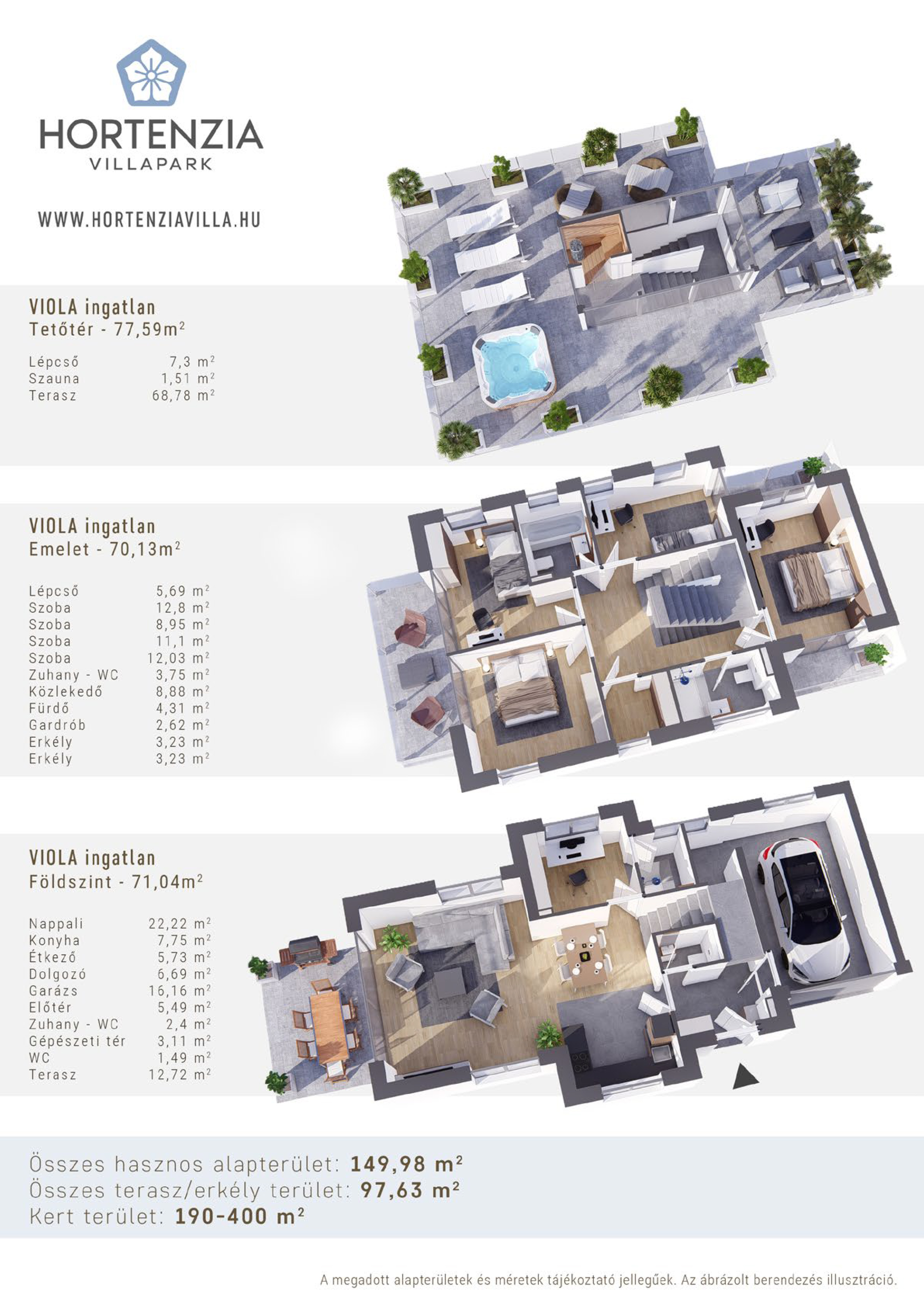 Az ikerházak (lakások) földszintből, emeletből és tetőteraszból állnak. Változó méretű 190-250m²-es kerttel, amerikai konyhás étkezős nappalival, minimum 4 szobával, dupla komforttal, két erkéllyel és három terasszal kerülnek kivitelezésre. Extraként a tetőterasz is teljes egészben használható, itt kerül elhelyezésre a kikapcsolódást fokozó szauna és a kellemes hangulatot adó jakuzzi is.