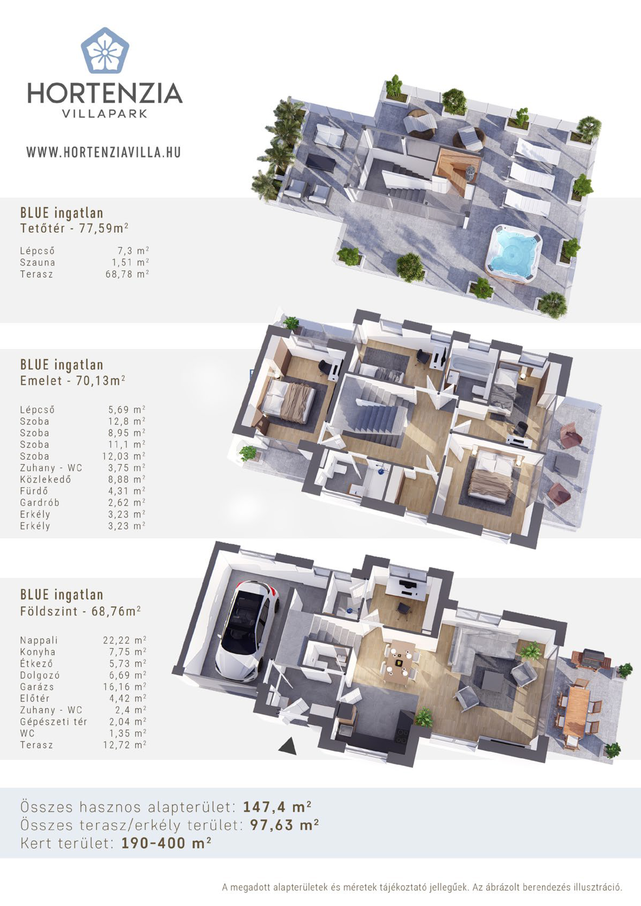 Az ikerházak (lakások) földszintből, emeletből és tetőteraszból állnak. Változó méretű 190-250m²-es kerttel, amerikai konyhás étkezős nappalival, minimum 4 szobával, dupla komforttal, két erkéllyel és három terasszal kerülnek kivitelezésre. Extraként a tetőterasz is teljes egészben használható, itt kerül elhelyezésre a kikapcsolódást fokozó szauna és a kellemes hangulatot adó jakuzzi is.