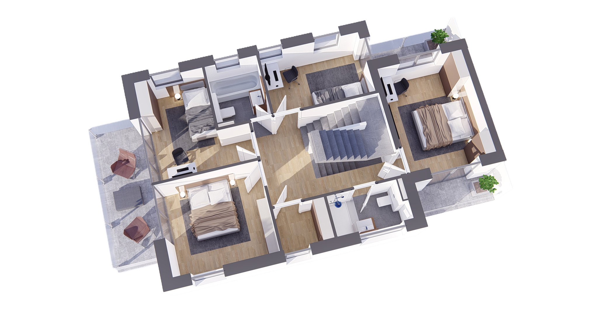 Az otthonok elrendezésében, alaprajzaiban is a tervező minden apró részletre figyelt, így megvédve a lakásokat elfoglaló családok intim szféráját, de közben és nem utolsó sorban a luxus kivitelhez tartozó műszaki és esztétikai tartalmakat is.